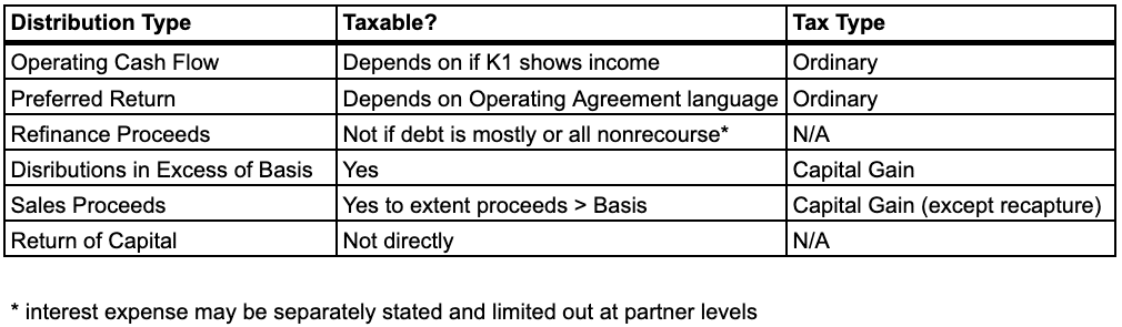 If investors know one thing it's how much cash they contributed ๐ธ and what they've received in return. ๐ซด Loss allocated to them over the years? Nah. Capital gain treatment vs. ordinary income? CPA jargon. Debt basis coded as qualified nonrecourse for at-risk? Nerd stuff. But those are pretty important distinctions that drive whether the money they receive as a distribution is actually taxable - and if taxable, at what rates. GPs think in terms of (1) returning capital, and (2) paying off pref(erred returns). Tax-smart advisors work to explain and integrate ๐ค the three points of view (investor, GP, tax) into a practical explanation - which is what we'll do today. The BasicsLet's start with the alpha. Here's a quick table to help explain common disconnects: Distributions can take many different forms - from operations (income), preferred returns, refinance proceeds, returns of capital, and sales proceeds. The Drivers of Tax ImpactsTax pros are looking at three things to determine if the investor will owe tax on that distribution: